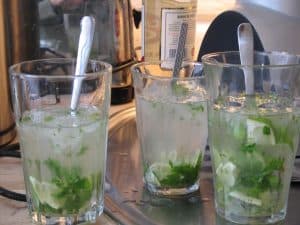 En cuanto a las bebidas en la cocina cubana hay que destacar el daiquiri (ron, azúcar, zumo de limón y hielo picado), el famoso y conocido mojito (ron, azúcar, limón, un poco de agua con gas, hojas de hierbabuena machacadas y hielo). El café cubano es un café bastante espeso y concentrado. Suele servirse en pequeñas cantidades y sin azúcar.